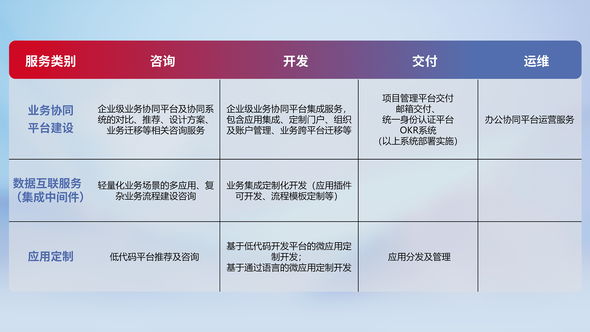 针对钉钉、、、企微、、、IDaas等平台级产品提供产品的规划、、、方案、、、、交付、、、、定制化开发等服务,,,,实现如统一协同办公、、、、智能客户服务、、混合会议管理、、、、智能数据查询、、、、等业务场景,,实现数字化转型。。