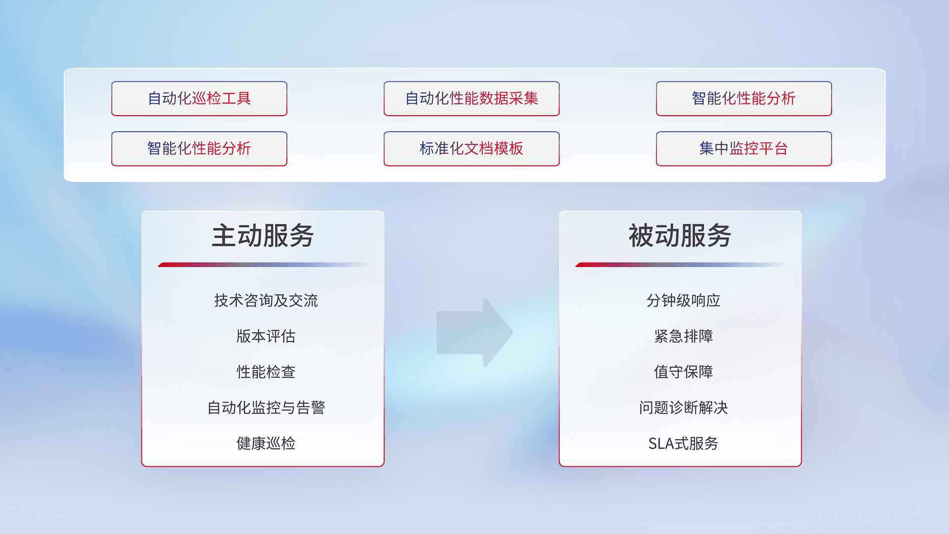 智能化工具和标准化文档,,保障服务质量,,,,提供主动服务(包含技术咨询、、版本评估、、、性能检查、、、、自动化监控与告警、、、、健康巡检)和被动服务包含(分钟级响应、、、紧急排障、、、值守保障、、、、问题诊断解决、、SLA服务)。。。。